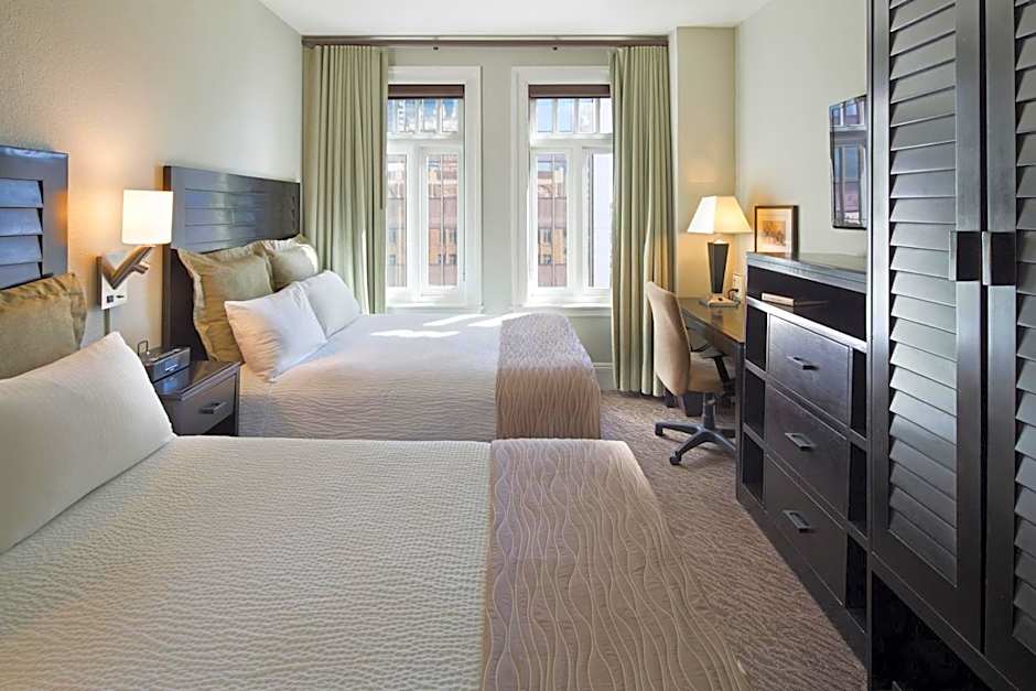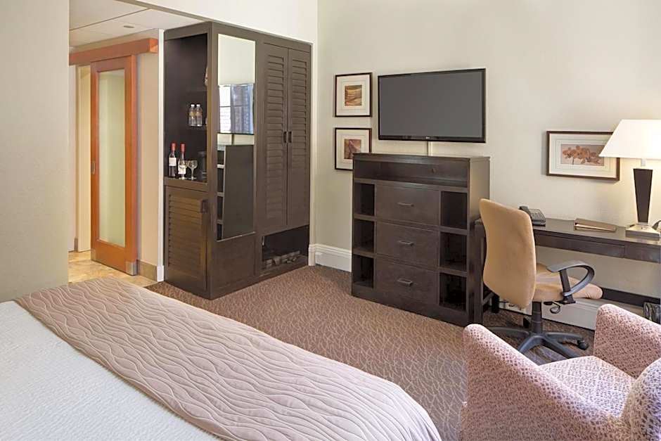 This air-conditioned suite have a in-room bathroom includes 1 king bed in the sleeping area and 1 queen sleeper sofa in the living area. It includes boutique bath amenities and toiletries, separate vanities with lighted make-up mirrors, a work desk with ergonomic chairs, a flat-screen TV, a microwave and a refrigerator.